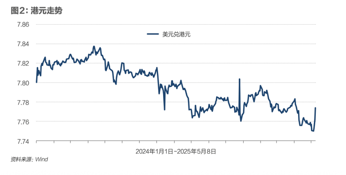 5月5日,港元连续第二个交易日触及其允许交易区间的强端,盘中一度升至区间上限7.75,此后抹去涨幅。5月9日开盘,港元汇率报7.7732。