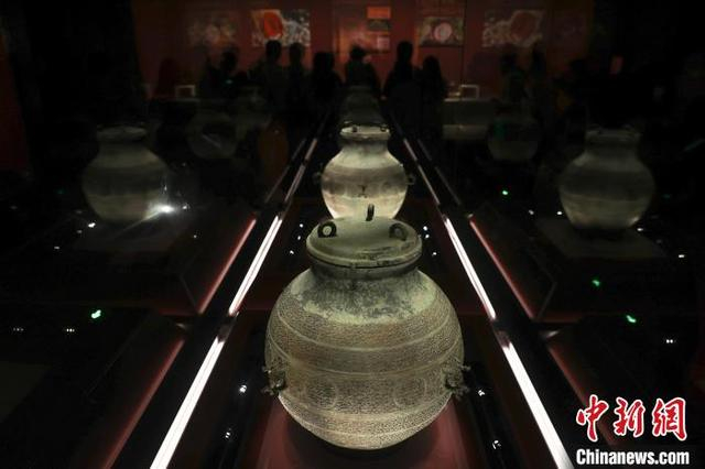 5月12日,江西南昌,南昌汉代海昏侯国遗址博物馆内展出的蟠螭纹铜缶。海昏侯刘贺墓是中国目前发现的结构最完整、布局最清晰、保存最完好的汉代列侯墓园,在南昌汉代海昏侯国遗址博物馆内,展出了大量出土的金器、五铢钱、青铜器、玉器、竹简等各类珍贵文物,堪称一部反映汉代鼎盛时期璀璨文化的百科全书。中新社记者 刘力鑫 摄