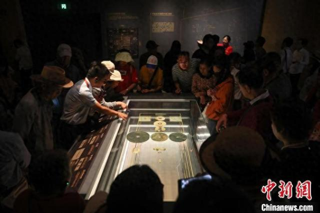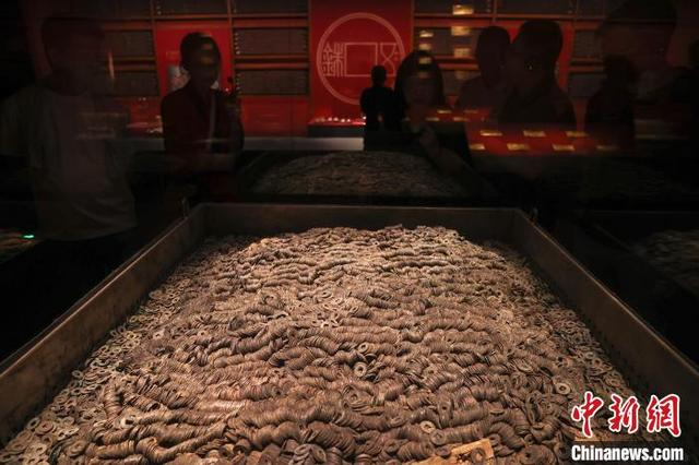 5月12日,江西南昌,游客在南昌汉代海昏侯国遗址博物馆内参观展出的大量五铢钱。海昏侯刘贺墓是中国目前发现的结构最完整、布局最清晰、保存最完好的汉代列侯墓园,在南昌汉代海昏侯国遗址博物馆内,展出了大量出土的金器、五铢钱、青铜器、玉器、竹简等各类珍贵文物,堪称一部反映汉代鼎盛时期璀璨文化的百科全书。中新社记者 刘力鑫 摄