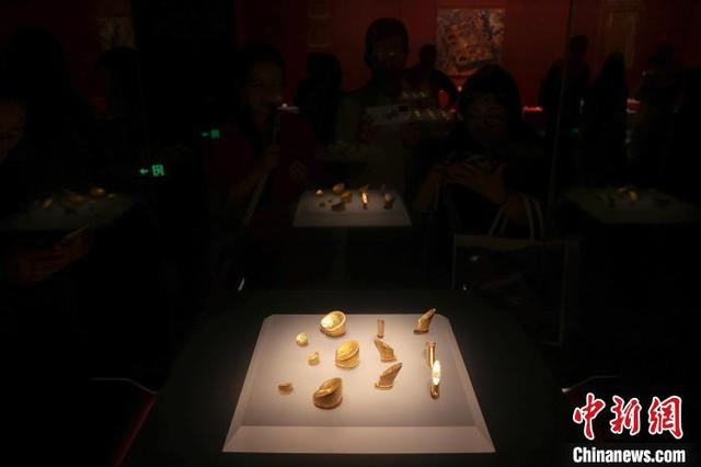5月12日,江西南昌,游客在南昌汉代海昏侯国遗址博物馆内参观展出的马蹄金,海昏侯刘贺墓出土了478件、重达115公斤的黄金器物,是迄今中国汉墓考古发现黄金数量最多的一次。海昏侯刘贺墓是中国目前发现的结构最完整、布局最清晰、保存最完好的汉代列侯墓园,在南昌汉代海昏侯国遗址博物馆内,展出了大量出土的金器、五铢钱、青铜器、玉器、竹简等各类珍贵文物,堪称一部反映汉代鼎盛时期璀璨文化的百科全书。中新社记者 刘力鑫 摄