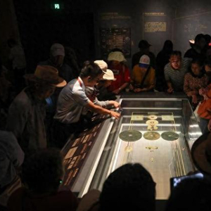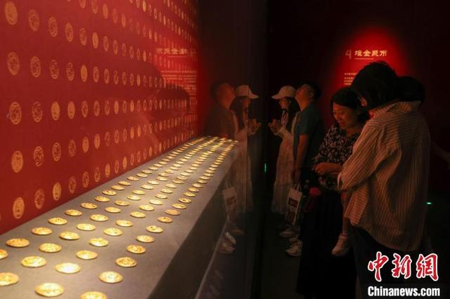 5月12日,江西南昌,游客在南昌汉代海昏侯国遗址博物馆内参观展出的饼形金,海昏侯刘贺墓出土了478件、重达115公斤的黄金器物,是迄今中国汉墓考古发现黄金数量最多的一次。海昏侯刘贺墓是中国目前发现的结构最完整、布局最清晰、保存最完好的汉代列侯墓园,在南昌汉代海昏侯国遗址博物馆内,展出了大量出土的金器、五铢钱、青铜器、玉器、竹简等各类珍贵文物,堪称一部反映汉代鼎盛时期璀璨文化的百科全书。中新社记者 刘力鑫 摄