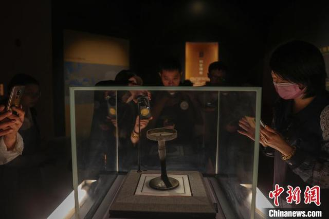 5月12日,江西南昌,游客在南昌汉代海昏侯国遗址博物馆内参观展出的“南昌”铭文青铜灯。海昏侯刘贺墓是中国目前发现的结构最完整、布局最清晰、保存最完好的汉代列侯墓园,在南昌汉代海昏侯国遗址博物馆内,展出了大量出土的金器、五铢钱、青铜器、玉器、竹简等各类珍贵文物,堪称一部反映汉代鼎盛时期璀璨文化的百科全书。中新社记者 刘力鑫 摄