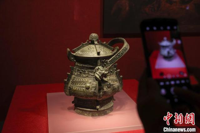 5月12日,江西南昌,游客在南昌汉代海昏侯国遗址博物馆内参观展出的西周凤鸟纹青铜提梁卣。海昏侯刘贺墓是中国目前发现的结构最完整、布局最清晰、保存最完好的汉代列侯墓园,在南昌汉代海昏侯国遗址博物馆内,展出了大量出土的金器、五铢钱、青铜器、玉器、竹简等各类珍贵文物,堪称一部反映汉代鼎盛时期璀璨文化的百科全书。中新社记者 刘力鑫 摄