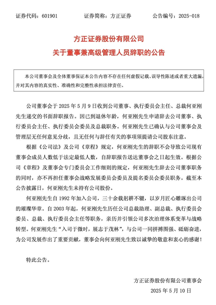 公告显示,2025年5月9日,方正证券董事会收到公司董事、执行委员会主任、总裁何亚刚提交的书面辞职报告。何亚刚因已到退休年龄,申请辞去上述多个重要职务。他明确表示,与公司董事会及管理层不存在任何意见分歧,也没有任何与此次辞任相关的事项需要提请公司股东特别关注。