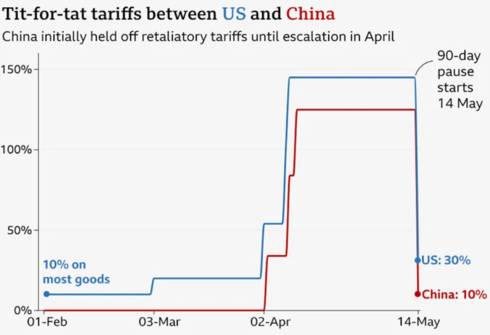 此后,在 4 月 8、9 日,在中国发起对等反制后,美国继续加码到 84%、125%,最终将税率推升到离谱的 145%。
