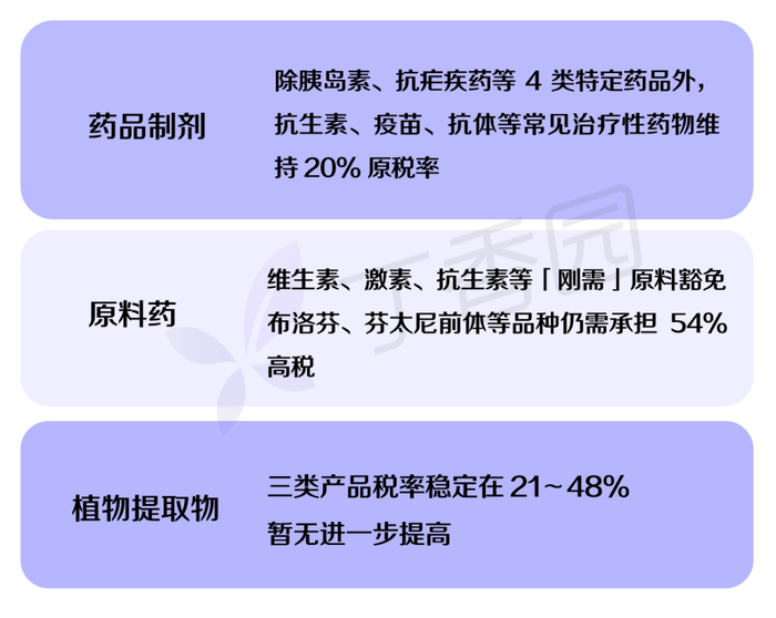 首先,在一波波关税暴涨中,药品和核心原料药大多都在豁免清单之内。