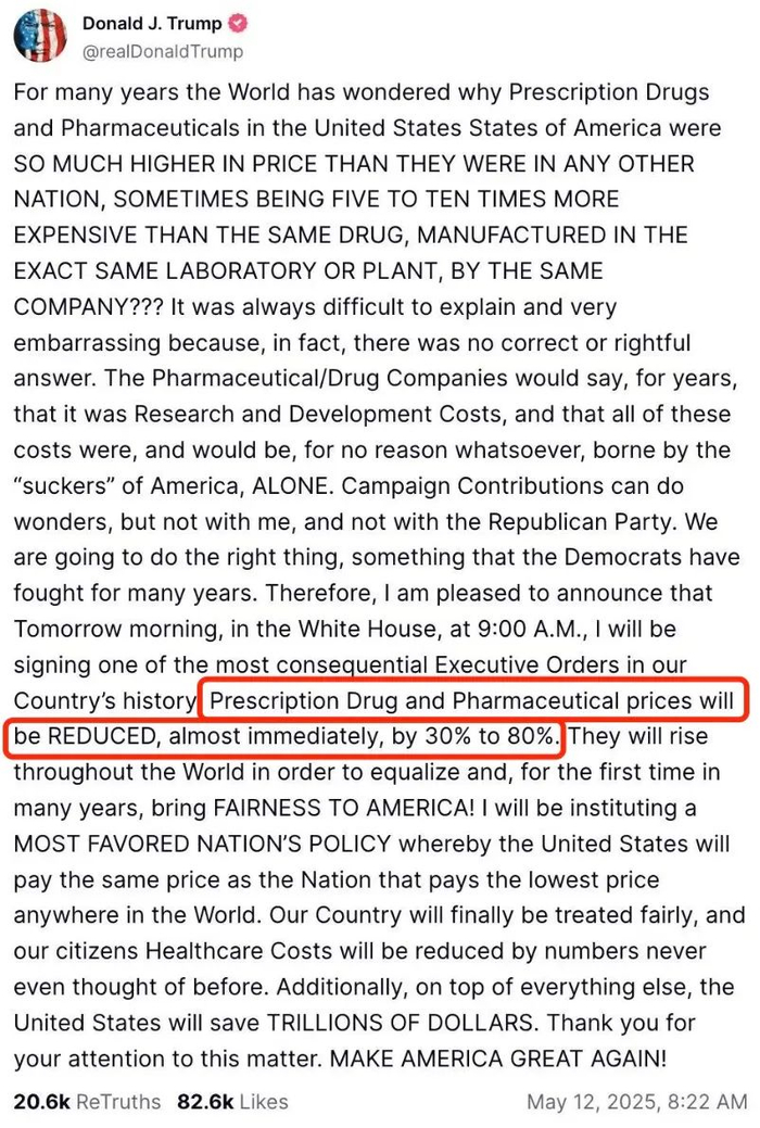 昨日晚间,特朗普在其社交平台发文称:「药企通过『研发成本高』的借口将利润转嫁至美国市场,导致同款药品在美国售价可能高达其他国家的 5~10 倍,美国必须要采取措施,不当冤大头。」