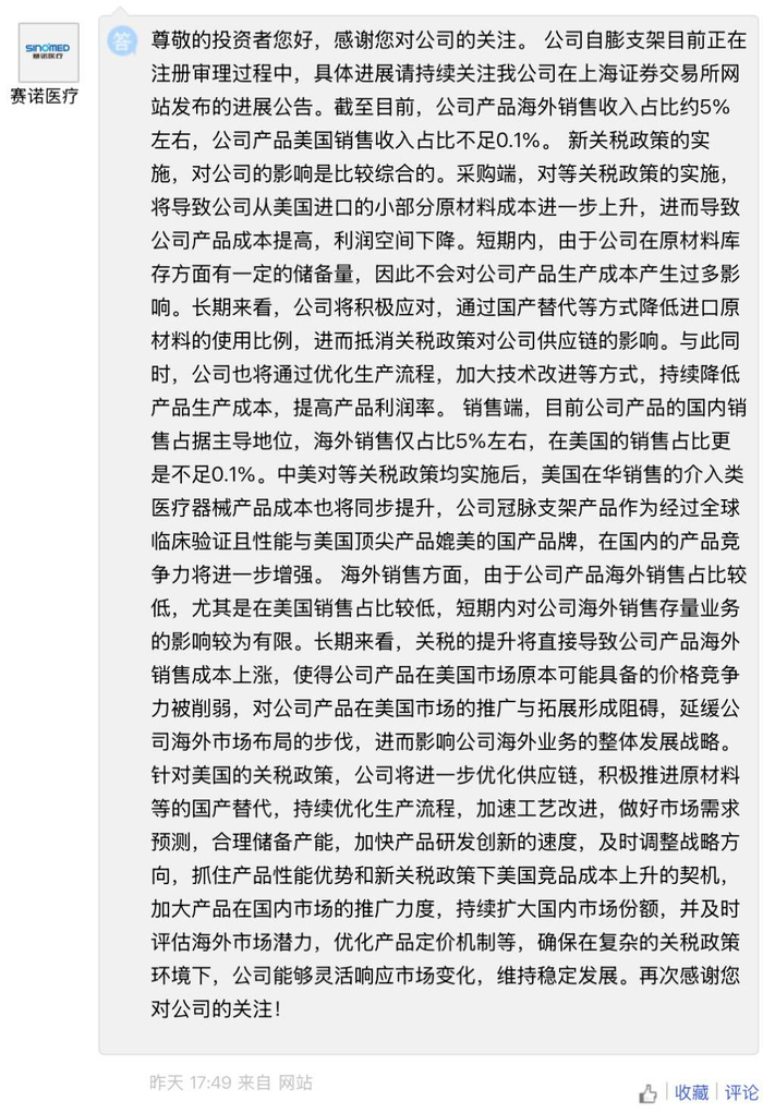 4 月份多家医疗器械公司给出的回应,都指出关税带来的影响主要集中在对供应链的长期调整——短期依赖储备量可以过渡,长期看则需要通过国产替代等方式重构供应链。
