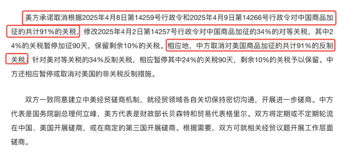 相应地,中方取消对美国商品加征的共计 91% 的反制关税;针对美对等关税的 34% 反制关税,相应暂停其中 24% 的关税 90 天,剩余 10% 的关税予以保留,同时暂停或取消对美国的非关税反制措施。[1]