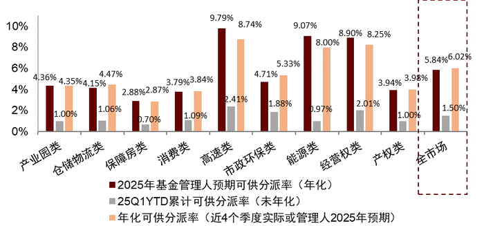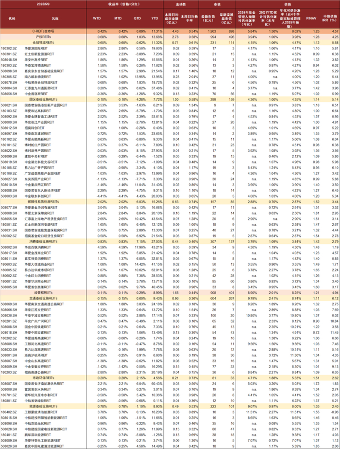 注:1)2025年基金管理人预期可供分派率(年化)基于各REITs招募书中的管理人预测2025年度可供分配金额年化计算;25Q1YTD累计可供分派率(未年化)基于各REITs2025年一季报披露的本年累计可供分配金额计算,未年化;年化可供分派率(近4个季度实际或管理人2025年预期)的计算中,满4个历史季报的REITs基于各最近4个季度累计可供分配金额计算,未披露满4个季报的REITs按招募书中的管理人预测2025年度可供分配金额计算,均按天数年化;C-REITs全市场、产权类REITs及经营权类REITs分派率采用总市值加权法计算;2)未发布2024年年报的REITs采用拟募集金额测算NAV,已发布2024年年报的产权REITs项目的NAV测算方式为(期末基金净资产+资产评估公允价值-投资性房地产-等同于发行溢价部分的商誉(如有))/发行份额,除华泰江苏交控REIT以其2024年年报披露的期末基金份额公允价值参考净值计算外,已发布2024年年报的经营权REITs项目的NAV均以账面净资产价值计算;3)C-REITs全市场、产权REITs、经营权REITs及各板块REITs收益率为模拟流通市值加权总回报指数的收益率,单个REIT的收益率则基于不复权价格涨跌幅以及分红收益加总计算;4)数据截至2025年5月9日