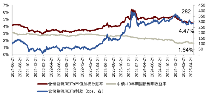 图表12:仓储物流REITs分派率与利差走势