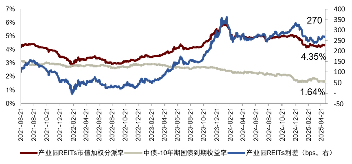 图表14:产业园REITs分派率与利差走势