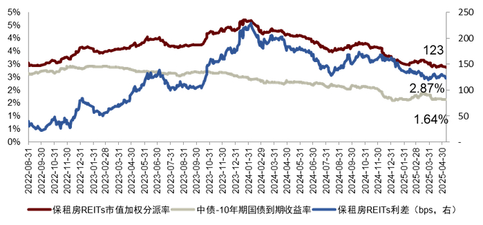 图表16:保租房REITs分派率与利差走势