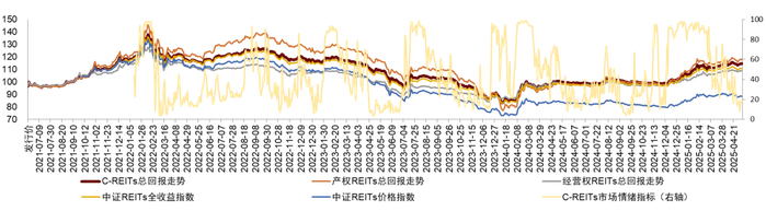 注:1)为方便对比,我们对中证REITs价格指数及全收益指数进行了起始日期标准化处理; 2)数据截至2025年5月9日