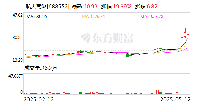 5月12日航天南湖(688552)收盘价40.93元,收盘涨停,全天换手率31.19%,振幅26.29%,成交额9.81亿元。科创板交易公开信息显示,当日该股因日换手率达30%、日收盘价涨幅达15%等上榜。