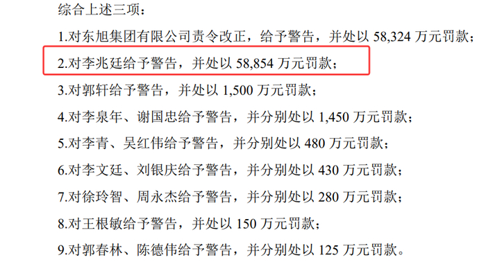 曾经的河北首富李兆廷等43名责任主体合计罚款17亿元,其中东旭集团罚款5.83亿,东旭蓝天罚款1000万,李兆廷个人被罚款5.8854亿。