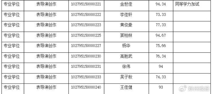 名单显示金世佳报考的是表导演创作专业学位,业务一科目成绩为94.34分,黄晓明报考的则是艺术管理/戏剧策划的专业学位,业务一科目成绩为89分。