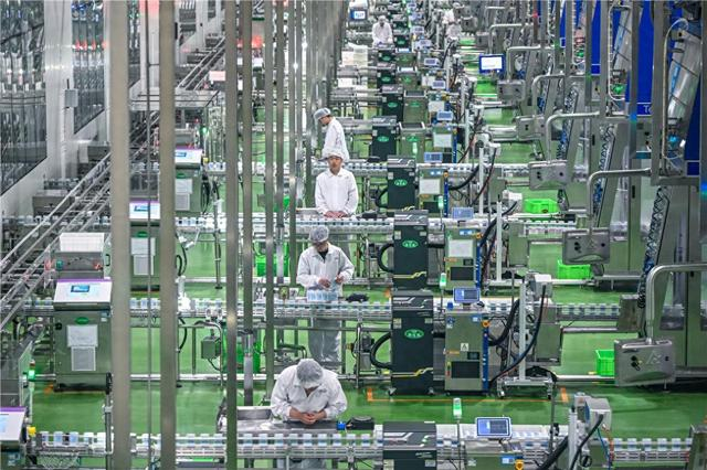 5月12日,在呼和浩特市伊利现代智慧健康谷液态奶全球智造标杆基地,工人在自动化生产线上检查液奶成品。随着国家出台一系列支持经济稳增长、提振内需的政策,奶业消费市场持续增长,为满足市场需求,内蒙古奶企正在开足马力加快生产。2025年一季度,伊利集团实现营业总收入330.18亿元,同比2024年第一季度增长1.35%,业绩企稳向好。