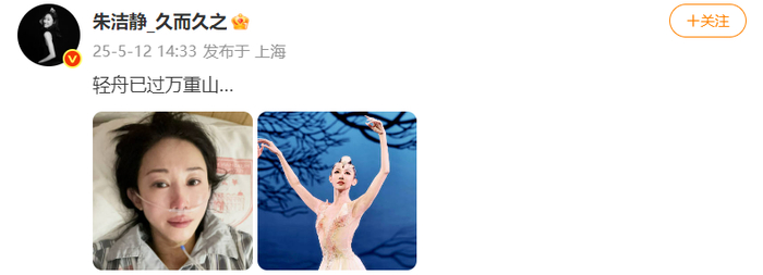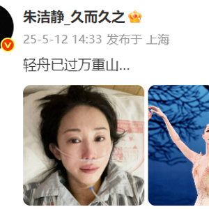 5月12日,知名舞蹈家、上海歌舞团荣典首席演员朱洁静在个人微博晒出躺在病床上和舞台上的照片,写道“轻舟已过万重山”。