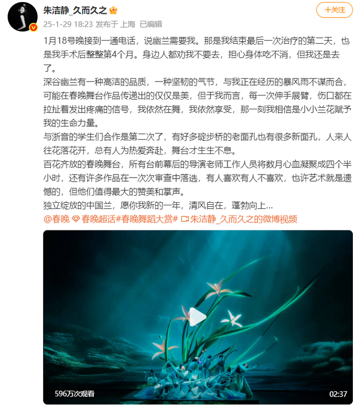 朱洁静曾在今年一月春晚舞台上表演舞蹈《幽兰》后回应病情,她发文称:手术后整整第4个月。身边人都劝我不要去,担心身体吃不消,但我还是去了。