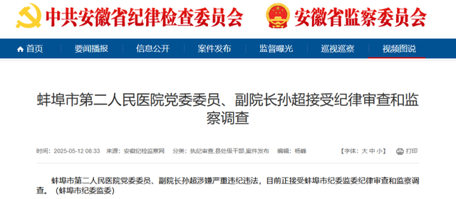 蚌埠市第二人民医院党委委员、副院长孙超涉嫌严重违纪违法,目前正接受蚌埠市纪委监委纪律审查和监察调查。(蚌埠市纪委监委)