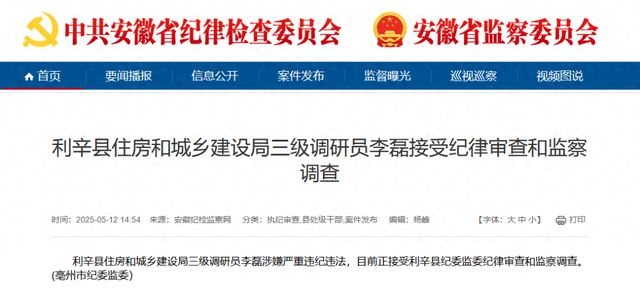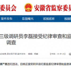 利辛县住房和城乡建设局三级调研员李磊涉嫌严重违纪违法,目前正接受利辛县纪委监委纪律审查和监察调查。(亳州市纪委监委)