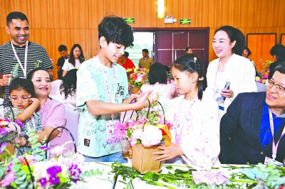 5月10日,在国际家庭日即将到来之际,以“繁华共筑家国梦,携手共绘地球村”为主题的2025年首都中外家庭共度国际家庭日活动在北京世界花卉大观园举行。图为中外小朋友互换插花作品。 中国妇女报全媒体记者 杨睿/摄