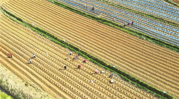 5月6日,走进毕节市威宁自治县牛棚镇鱼塘社区的烟田,数十名群众正在有条不紊地打窝施肥、放苗浇水、覆膜盖土……不一会儿,一株株翠绿鲜嫩的烟苗在微风中摇曳。