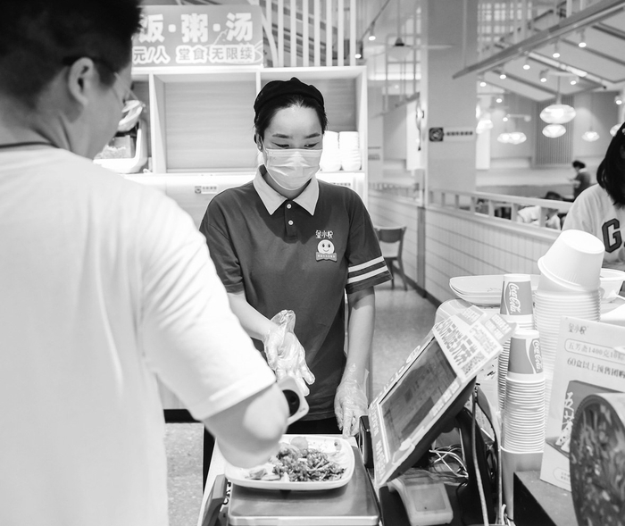 5月8日,在嘉兴市南湖区金小悦饭堂,90后“零工妈妈”焦兴艳在岗位上工作。她每天早上送完孩子上幼儿园后来到店里上班,下午3点左右下班去接孩子放学,既能照顾孩子也增加了收入。