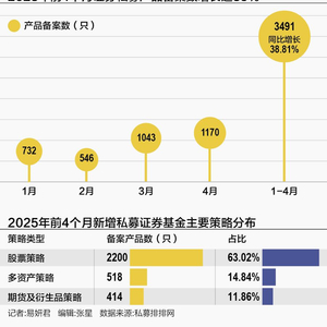 私募排排网最新统计数据显示,今年前4个月,全市场新备案了3491只私募证券产品,同比增长了38.81%。从单月度来看,今年3月、4月,新备案私募证券产品分别达到1043只、1170只,呈现环比增长势头。