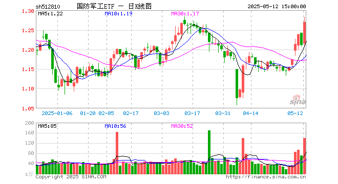 5月12日,国防军工ETF(512810)涨4.79%,成交额1.76亿元。当日份额减少200.00万份,最新份额为5.25亿份,近20个交易日份额减少1600.00万份。最新资产净值计算值为6.65亿元。
