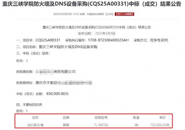 近日,有网友发消息称,2025年5月发布的《重庆三峡学院防火墙及DNS设备采购(CQS25A00331)中标(成交)结果公告》中,重庆三峡学院采购的“普联TL-R473G出口防火墙”,中标价格为75万元一台,但该型号产品在某电商平台普联官方旗舰店售价仅299元,质疑其中标价格不合理。