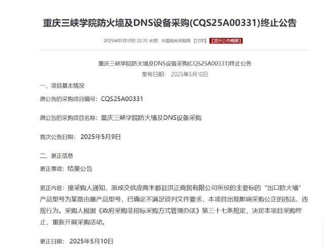 极目新闻记者就此事搜索发现,2025年5月10日晚10时许,中国政府采购网发布了一则《重庆三峡学院防火墙及DNS设备采购(CQS25A00331)终止公告》,更正信息一栏中显示:“接采购人通知,原成交供应商丰都县洪正商贸有限公司所投的主要标的‘出口防火墙’产品型号为某路由器产品型号,已确定不满足谈判文件要求,本项目出现影响采购公正的违法、违规行为。采购人根据《政府采购非招标采购方式管理办法》第三十七条规定,决定本项目采购终止,重新开展采购活动。”更正日期为2025年5月10日。