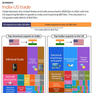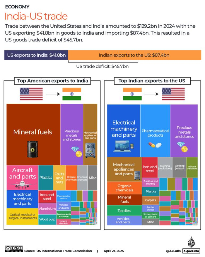 2024 年,美国和印度之间的贸易额达到 1292 亿美元,其中美国向印度出口 418 亿美元的商品,进口 874 亿美元的商品,导致美国商品贸易逆差达到 457 亿美元