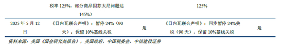 中美日内瓦经贸会谈后,美国对中国今年加征的全面关税为30%(20%的“芬太尼关税”和10%的基准关税),另有24%的对等关税给予90天暂缓,报复关税全部取消,最终平均有效关税为42.4%。中国对美国加征的全面关税为10%,另有24%的对等关税给予90天暂缓,报复关税全部取消。需要注意的是,4.2取消豁免的小额包裹关税尚不清楚是否继续征收,但后续对中国小额包裹加征的关税应该在本轮谈判中被同步取消。而中国也取消了4.2起实施的关键矿产出口管制等反制措施,4.2之前实施的则不受影响。