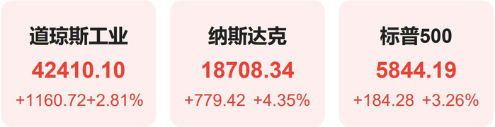 截至收盘,标普500指数涨3.26%,报5844.19点;道琼斯指数涨2.81%,报42410.10点;纳斯达克指数涨4.35%,报18708.34点。