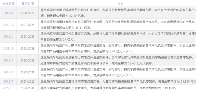 公司主要合作采埃孚,在手定点项目周期长、金额大。2019年6月,公司获得采埃孚定点,后者为德国汽车零部件巨头,客户包括华晨宝马、吉利等头部企业。2020年公司与采埃孚中国分别以74%/26%的股份成立卧龙采埃孚汽车电机有限公司,围绕新能源汽车电机相关产品进一步布局,后续收到多个项目定点,如星驱动力12.66亿元项目、威睿7.19亿元项目、小鹏6亿项目……公司目前合计定点项目金86.4亿元,客户粘性较高,履约时间普遍较长,将持续稳步贡献业绩支撑。