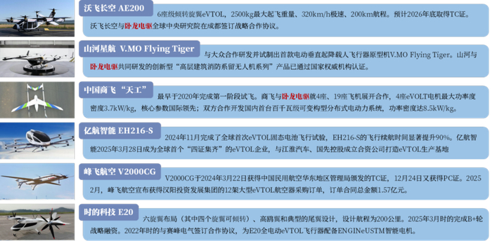 eVTOL机型密集推出,卧龙技术领先。国内外头部厂商纷纷发布eVTOL车型,其中卧龙与中国商飞、山河星航、沃飞长空、万丰奥威等企业机构均有合作。