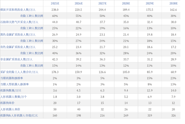 在公司下游行业中,我们选取危险系数较高的采矿业中的煤炭开采和洗选业、石油和天然气开采业、黑色金属矿采选业、有色金属矿采选业、非金属矿采选业做简单测算,按照第五次经济普查数据线性外推其未来5年内从业人数变化,并根据各行业危险工种情况假设五大行业2025年危险工种比例分别为60%、25%、30%、40%、15%,并随着技术进步逐渐降低。在计算得到采矿业合计危险工人数量后,简单假设每年机器人、机器狗的每年可渗透率及售价,最后可得出2025-2030年四足或人形机器人的市场空间CAGR可达15%,2030年市场空间或达326亿元。