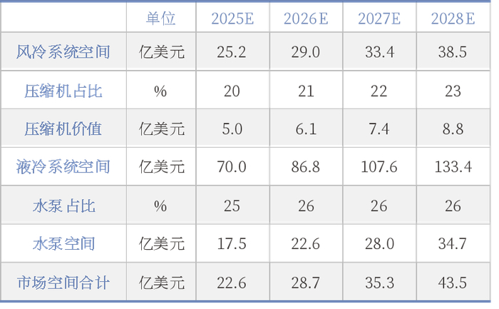 节能降碳是主旋律,公司产品以进入数据中心等高标准供应体系。2022年《工业能效提升行动计划》目标十四五期间规上工业单位增加值能耗下降13.5%。节能降碳成为全球工业转型的重点方向,Omdia预测2020~2025年全球IE3和IE4电机的安装量CAGR有望达到22%。以数据中心为代表的新质生产力能效要求则更高:2024年《数据中心绿色低碳发展专项行动计划》目标2025年底新建及改扩建大型和超大型数据中心/国家枢纽节点数据中心项目的PUE分别不高于1.25/1.2,改进策略包括使用高能效空调风机或液冷系统等。通过假设数据中心风冷/液冷系统占比、水泵及电机单价,我们测算2025-2028年风冷压缩机+液冷系统水泵的市场空间累计达130亿美元。目前公司EC电机、水泵等可用于数据中心,已交付如阿里、比亚迪等客户。