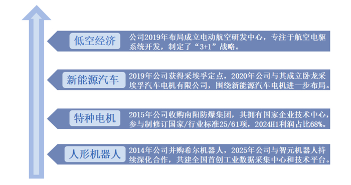 四十年深耕积累电机行业经验,聚焦主业,积极收并购扩大业务版图。公司成立于1984年,目前已成为全球电机产品龙头,2023年公司高压电机产品全球市占率11%排第一。回顾公司发展史,公司始于又不限于工业电机领域,40+年经验积累使得管理层深谙电机行业发展逻辑,坚持高端制造升级,对行业发展趋势具有前瞻判断。以电机电驱技术为核,公司现已布局机器人、低空、防爆电机、新能源汽车等领域,同时更聚焦主业,新能源业务已于25Q1出表。