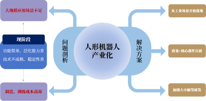 人形机器人产业化挑战之一:成本难题。一方面,技术密集型架构推高硬件成本,其核心的仿生关节模组、灵巧手等未形成成熟供应链,丝杠、传感器等部分高端零部件依赖进口难降本,宇树H1人形机器人售价为65万元,超过上海人均4年收入;另一方面,尽管人形机器人“大脑”已有通用大模型作参考,但“小脑”开发仍需持续高强度的研发投入,高质量训练数据库搭建成本高。我们认为突破依赖于提升核心零部件国产化率、智能化“涌现与顿悟”、规模化生产等。