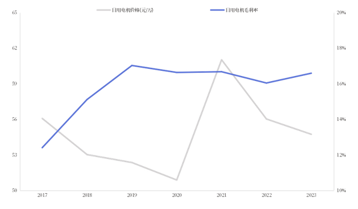 图21:公司日用电机单价(左)及毛利率(右)情况