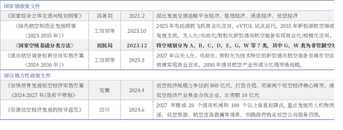 低空经济政策密集催化,管制放开激发活力。23年12月空管委正式发布《国家空域基础分类方法》,新增G、W类非管制空域,解放了eVTOL、无人机等通用航空的物理空间束缚,快速发展有法可依,同月中央经济工作会议首将低空经济列为战略产业。24年3月《通用航空装备创新应用实施方案(2024-2030年)》提出2027年“商业应用”、2030年形成万亿规模市场的目标,随后安徽、四川等各地纷纷落地政策,低空产业迎来政策黄金期。目前我国空域管理实质仍是由空管委在中央军委的直接领导下完成,使用空域必须经过军方严格的审批和监管。25年4月空管委印发专项措施向全国空管系统部署加强低空空管工作,其中明确“有效释放空域资源”。