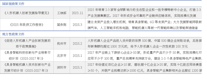 具身智能定位未来产业,地方政策迅速更跟进。2025年政府工作报告提出“建立未来产业投入机制,培育具身智能等未来产业”,人形机器人是智能机器人的最高形态。地方则给出更明确的发展目标甚至直接补贴。我们认为人形机器人已上升至国家战略高度,在当前国际形势复杂,强调科技安全、自主可控等背景下,行业有望获得长期持续的政策支持,成为未来重要成长主线之一。