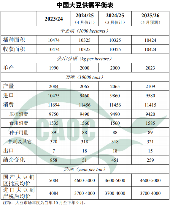 大豆:本月对2024/25年度中国大豆生产、消费估计值与上月一致,将大豆进口量上调400万吨至9860万吨,仍低于上年度水平,主要是南美新作大豆丰产,目前已进入供应旺季,出口中国数量高于预期。当前正值东北产区大豆春播关键时期,主产区大豆种植意愿总体稳定,土壤墒情良好,春播进度加快。预计2025/26年度中国大豆播种面积10424千公顷,较上年度增长1%;单产每公顷2023公斤,较上年度提高1.1%;产量保持在2000万吨以上。当前生猪产能处于合理区间,随着饲用豆粕减量替代技术的逐步推广,豆粕消费量将继续下降,大豆进口量相应减少;食用消费量保持稳中有增趋势。预计2025/26年度中国大豆进口量9580万吨,较上年度减少2.8%;大豆消费量1.14亿吨,与上年度基本持平。