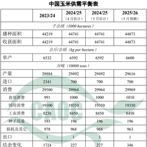 玉米:本月对2024/25年度中国玉米供需平衡表不作调整。本月预测,2025/26年度,中国玉米种植面积44873千公顷(6.73亿亩),较上年度增加132千公顷(198万亩),增幅0.3%,主要原因是玉米田间管理相对简单,出售渠道畅通,叠加进口大幅下降,市场普遍看好后市,农户种植积极性保持稳定。今年玉米东北产区气象条件总体利于播种,预计玉米单产每公顷6600公斤(每亩440公斤),较上年度稳中有增。总产量29616万吨,较上年度增0.4%。需求方面,生猪产能将处于合理区间,玉米饲用消费需求保持基本稳定;深加工企业开机率有所下降,但产能保持增长,玉米工业消费量有望保持稳定;预计2025/26年度玉米消费量29969万吨,较上年度基本持平,进口量继续保持在配额之内。