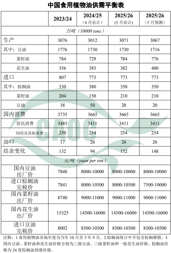 本月预测,2025/26年度,中国食用植物油产量3067万吨,比上年度减少4万吨,其中豆油产量1716万吨,菜籽油产量776万吨,比上年度分别减少14万吨、8万吨,主要是因为大豆和油菜籽进口量下降;花生油产量400万吨,比上年增加18万吨,主要是受种植效益较好、政策支持力度加大等影响,花生播种面积预计增加。食用植物油消费量预测值与上年度一致。