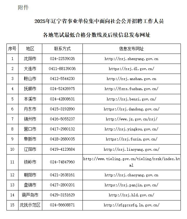 三、各市(沈抚示范区)事业单位笔试最低合格分数线