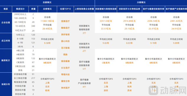 本届4张主榜单,共计400家企业上榜,总估值约为1.14万亿元,总平均估值同比下降约9.9%。和历届榜单情况类似,85%的上榜企业估值集中于10-60亿元区间,构成大健康产业非上市公司主要群体。另外,共有11家企业估值突破百亿,2家企业估值在200亿元以上,估值排名TOP10企业估值均值达144.47亿元。